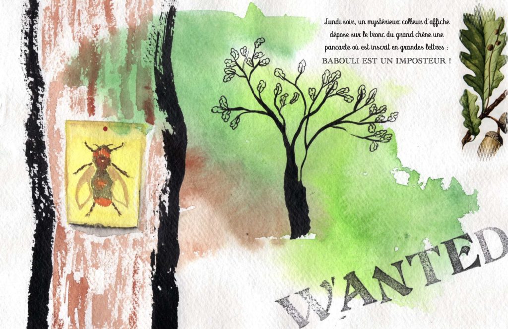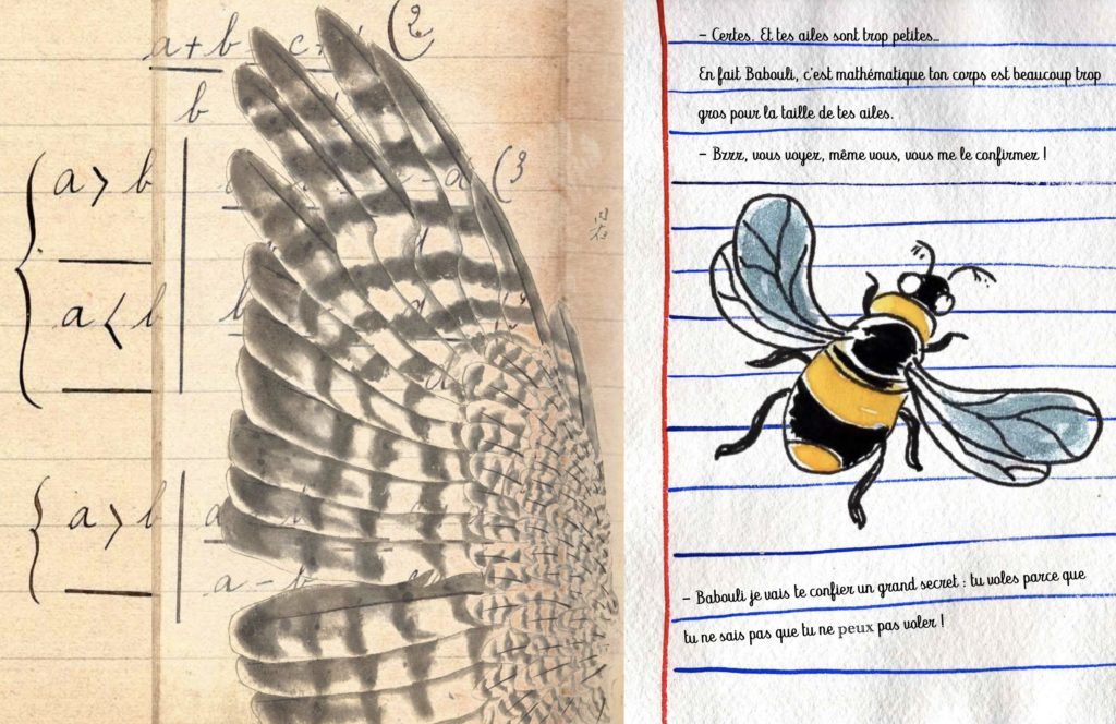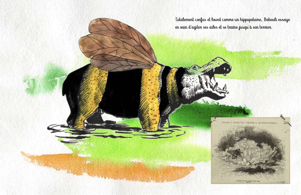 Pour ce projet d’album où mon héros est un bourdon, l’inspiration m’est venue quand mon fils étudiant en biologie m’a expliqué le quasi mystère qui entoure la faculté de vol de cet insecte. J’ai situé son histoire dans un univers de suspicion qui parfois prend place également dans les cours d’école. Une manière d’aborder le double sujet des « fake news » et du harcèlement mais aussi les effets que peuvent avoir ces injonctions sur la personnalité même de l’individu qui les subies.