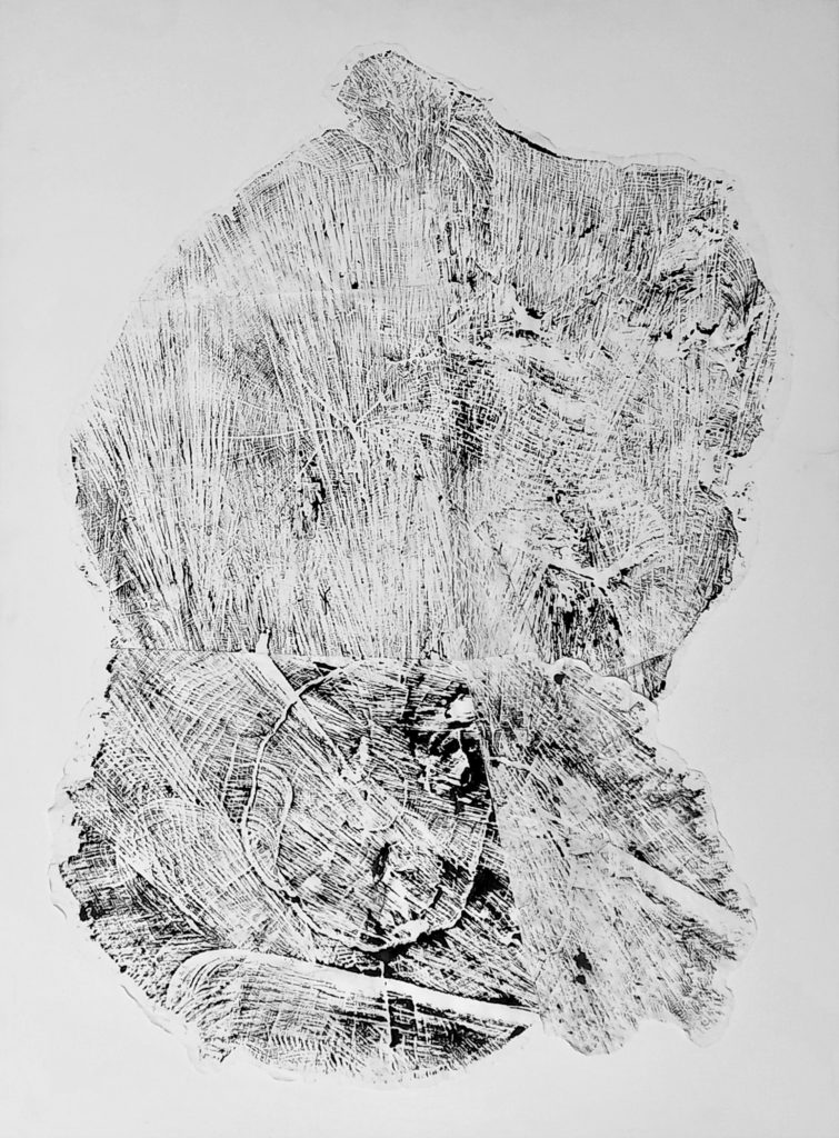Créée pour la série Empreinte Carbonne en 2016, cette toile est composée de divers morceaux d’empreintes d’arbres réalisées à l’aide de la technique du monotype sur papier de riz à l’encre de chine et acrylique noire. Les fragments de souches ainsi assemblés recomposent la trace d’un arbre imaginaire.