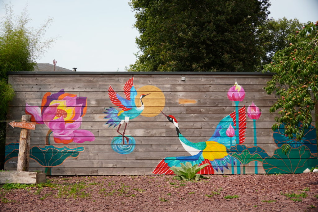 Les fresques murales sont aussi un autre terrain d’expression que j’investis. J’apprécie l’empreinte laissée sur des murs, la plongée dans la couleur qu’elle nécessite et les formats larges qui impactent le regard.